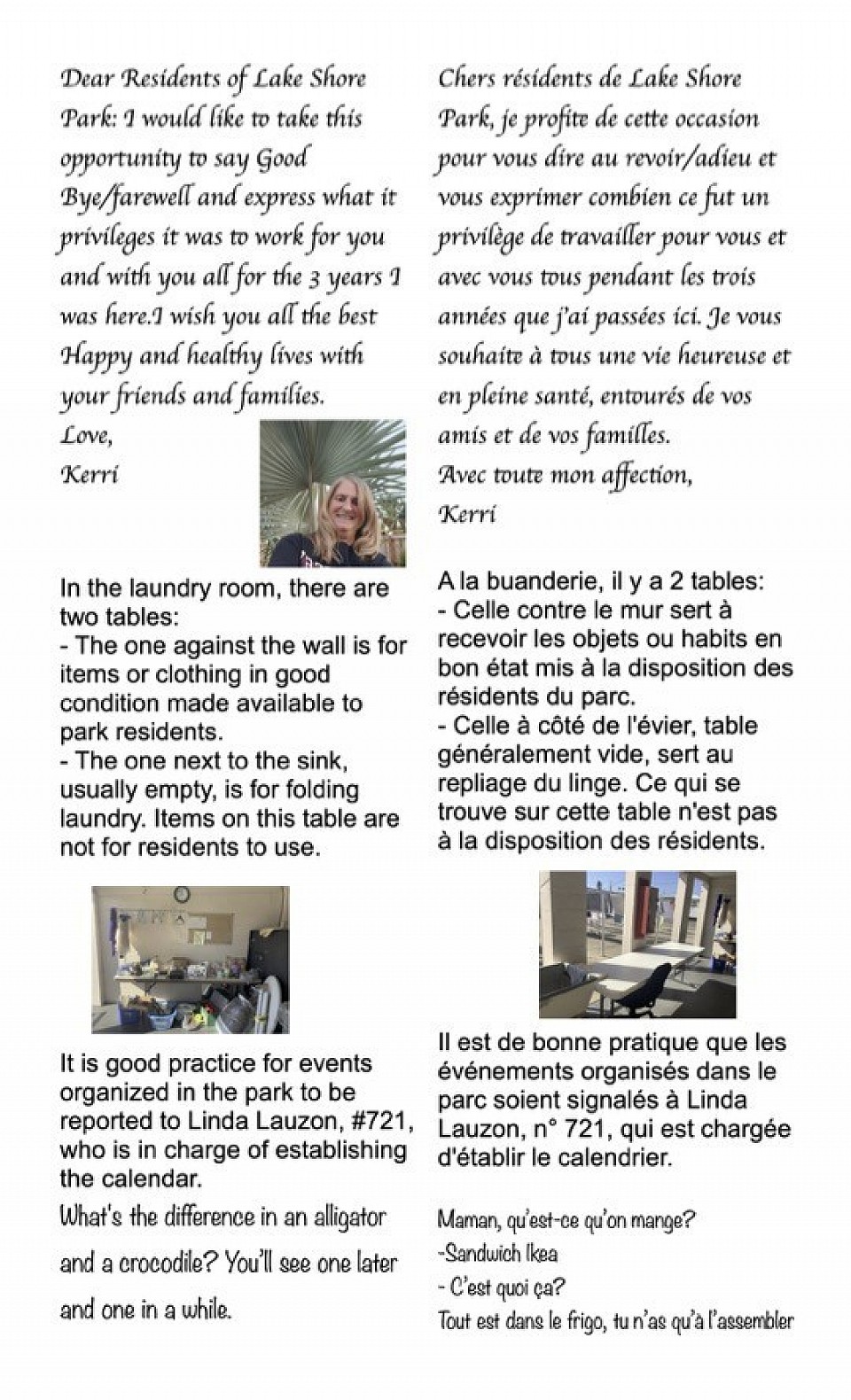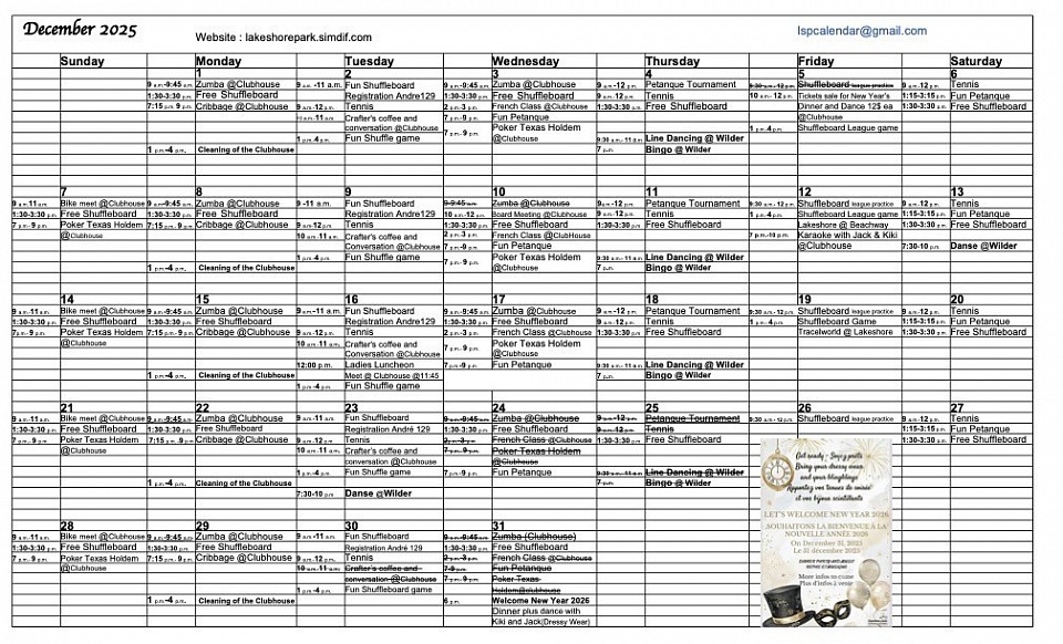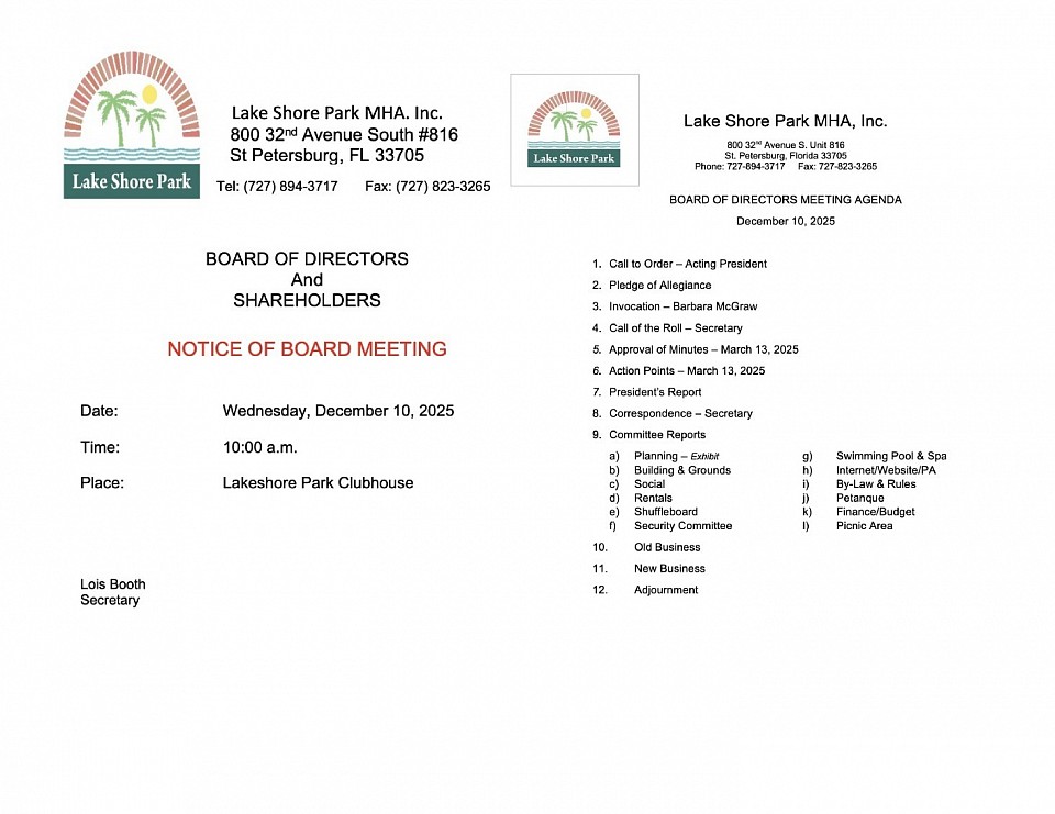 LakeShore Park, St Petersburg, Lake Maggiore, Florida, mise à jour samedi 6 décembre 2025 ( pour les infos réservées aux résidents du parc, demandez votre "username" et votre "password" via "contact")